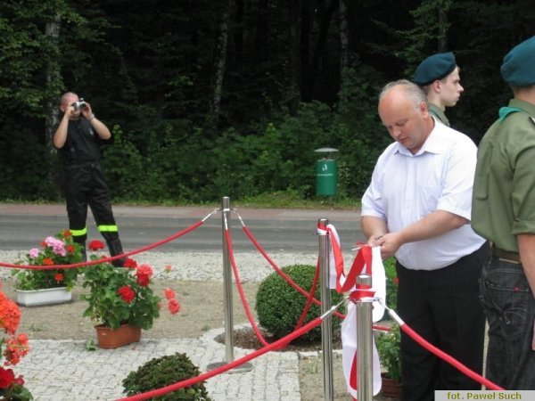 W tym uroczystym dniu chciałbym podziękować panu Markowi Barzykowi za przekazanie gminie części działki pod przebudowę pomnika, chciałbym podziękować Sołtysowi i Radzie Sołeckiej za inicjatywę przeznaczenia funduszu sołeckiego na budowę, Radzie Gminy za akceptację zadania, chciałbym podziękować projektantowi i wykonawcy panu Mirosławowi Babiczowi oraz pracownikom Urzędu Gminy, którzy wykonali prace wykończeniowe i porządkowe.