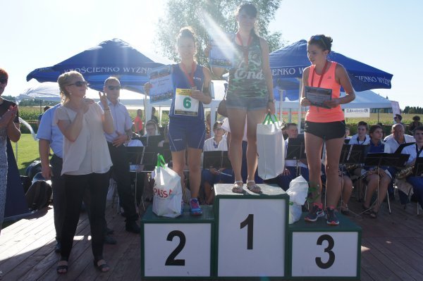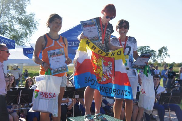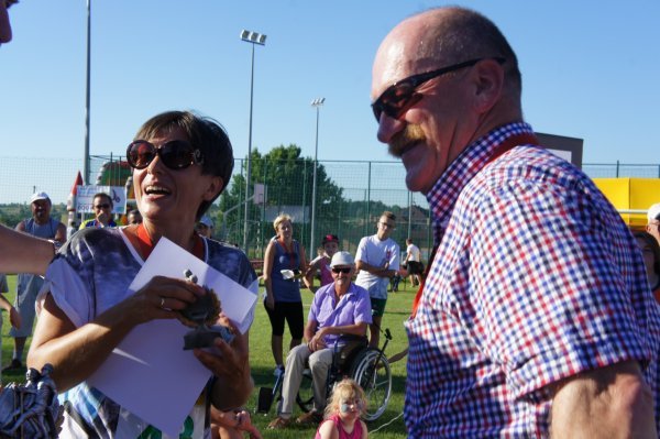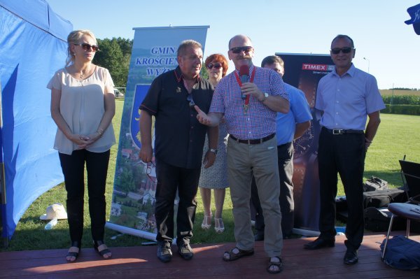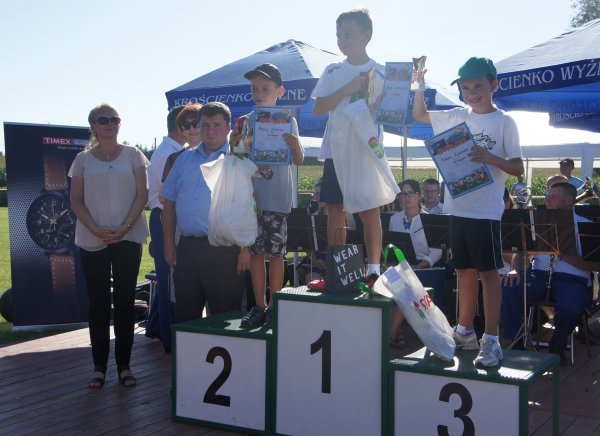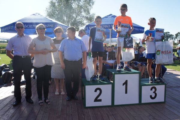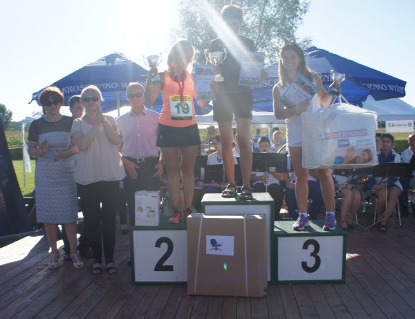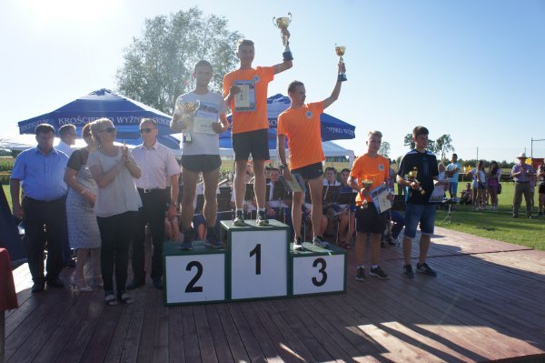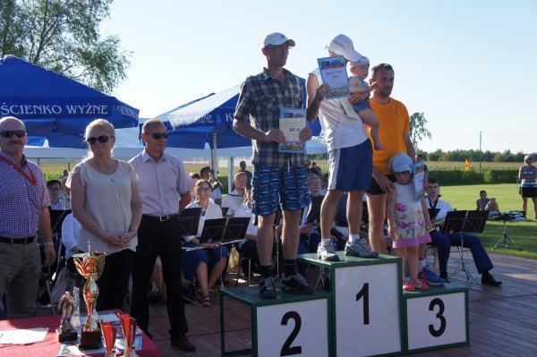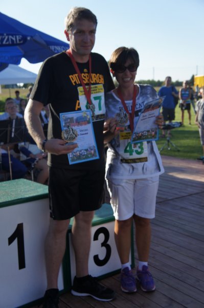 Zanim jednak w szranki stanęli starsi zawodnicy, na stadionie Gminnego Ośrodka Sportu i Rekreacji rywalizowały dzieci i młodzież w sześciu kategoriach wiekowych. Od najmłodszych, którzy niedawno nauczyli się chodzić do chłopców i dziewcząt z gimnazjów. Jak co roku najwięcej emocji wzbudził bieg dzieci z rodzicami. Najmłodszy zawodnik w tej kategorii Franciszek Grygolec z Krościenka Wyżnego miał niecałe 1,5 roku i dzielnie pokonał dystans 100 metrów. Dla porównania, najstarszym uczestnikiem biegu na 10 km był Pan Kazimierz Kuropatwa, który w kwietniu ukończył 73 lata. Pan Kazimierz przyjechał do Krościenka na rowerze, przebiegł „Dychę Siekiernika” zgarnął nagrodę w swojej kategorii, wsiadł na rower i wrócił do Przemyśla. Widać, że bieganie może być wielką pasją przez całe życie, o czym świadczy również liczba i wiek startujących w Krościenku. Łącznie w zawodach udział wzięło 402 sportowców. 183 w biegach dzieci i młodzieży oraz w sumie 219 w biegach na 5 km i 10 km oraz nordic walking. Wszystkie dzieci otrzymały paczki a dla starszych organizatorzy przygotowali darmowy posiłek. Puchary, dyplomy i nagrody rzeczowe lub finansowe w 40 kategoriach otrzymało 116 osób. Dekorujący zwycięzców mieli naprawdę dużo pracy. Pamiętając o temperaturze powietrza jaka panowała tego dnia dziękujemy za uświetnienie ceremonii zamknięcia Imprezy i wręczanie nagród najlepszym zawodnikom i zawodniczkom: zastępcy wójta gminy Krościenko Wyżne Alicji Fejkiel-Guzik, przewodniczącemu rady gminy Antoniemu Dębcowi, radnemu gminy Edwardowi Marszałkowi, dyrektor szkoły podstawowej w Krościenku Wyżnym Marcie Such oraz radnemu powiatu krośnieńskiego Markowi Aftanasowi. Szczególną rolę w tym dniu odegrał również Pan Stanisław Jagieło, który swoim kunsztem komentatorskim i profesjonalna postawą zapewnił wspaniałą oprawę imprezie. Wywiady z zawodnikami i ciekawe komentarze były „wisienką na torcie” całych zawodów. Dobrze przygotowane trasy, ciekawe nagrody i wiele innych atrakcji były promocją naszej gminy. Wierzymy, że sportowcy którzy 28 sierpnia przyjechali do nas z całej Polski swoimi pozytywnymi komentarzami „przyciągną” za rok kolejnych biegaczy.