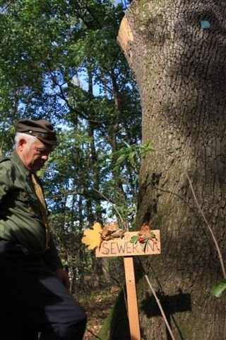 Spod „Aleksandra” redaktorzy Kleksa poprowadzili wszystkich do kolejnego przystanku, nieco na wschód, tuż nad rzeką rosną bowiem obok siebie dwa potężne dęby, które dzieci odkryły wiosną, podczas kręcenia filmu o Literackim Szlaku Drzew dla TV OBIEKTYW. W czerwcu przygotowały wniosek o nadanie im imion „Seweryn” i „Ludwik”. Wniosek ten został pozytywnie rozpatrzony przez władze gminy, a odpowiednią uchwałę odczytała w plenerze sekretarz gminy Alicja Fejkiel – Guzik. Pod drzewami zainstalowano pięknie udekorowane tabliczki imienne przygotowane i przyniesione przez szkolnych dziennikarzy. Następnie opowiedzieli oni o dębach i osobistościach, które dały im imiona. Ania Rymarz mówiła o „Sewerynie”, większym spośród dwóch olbrzymów, rosnącym bliżej Wisłoka. Jego imię pochodzi od Seweryna Goszczyńskiego(1801 – 1876)- wybitnego poety, uczestnika powstania listopadowego, konspiratora, podróżnika, autora wierszy, np. „Uczta zemsty”, powieści poetyckiej „Zamek kaniowski” i powieści prozą pt. „Król zamczyska”. Jako świetny etnograf dał się on z kolei poznać w „Dzienniku podróży do Tater”. Seweryn Goszczyński był częstym gościem krościeńskiego dworu, gdyż z powodu swojej aktywnej konspiracyjnej pracy często zmieniał miejsca pobytu. Przyjeżdżał tu do Jabłonowskich. Z Krościenka urządzał wyprawy na zwiedzanie okolicy. Któregoś dnia gospodarz -hrabia Jabłonowski- zawiózł go do Odrzykonia. Ruiny zamku i cała panorama zrobiły na nim wielkie wrażenie, podobnie zresztą jak ich „król” – wariat Machnicki. Być może, że swoje obserwacje z wycieczki przemyśliwał Goszczyński, spacerując po Dębinie, a może nawet przysiadając pod dębem nad Wisłokiem. Faktem jest, że ówczesne przemyślenia i wspomnienia zamknął w „Królu zamczyska”, opowieści o człowieku, który popadł w obłęd z miłości do ojczyzny. Ponieważ Goszczyński przyjaźnił się z Ludwikiem Jabłonowskim, postanowiono właśnie jego imię nadać drugiemu z wiekowych dębów – po to, by przyjaciele mogli wciąż być ze sobą, jak tłumaczyły dzieci. O „Ludwiku” mówiła Klaudia Mercik. Podkreślała, że Jabłonowski żył w latach 1810-1887 i był pamiętnikarzem, poetą oraz działaczem politycznym. Uczestniczył w powstaniu listopadowym i Wiośnie Ludów, związany był z konspiracją galicyjską i środowiskiem lwowskim. Był posłem do sejmu stanowego. Prywatnie był bratem Leona, męża Cecylii z Fredrów Jabłonowskiej. Z tego powodu pomieszkiwał w krościeńskim dworze. Ludwik Jabłonowski jest autorem pamiętnika „Złote czasy i wywczasy”, w którym poczytać możemy o życiu naszego dworu w XIX w. To do niego do Krościenka przyjeżdżali wielcy ludzie ze świata, m.in. Wincenty Pol czy Aleksander Fredro. Jak już wspomniano, przyjaźnił się z Sewerynem Goszczyńskim, który również odwiedzał go w Krościenku. Obaj panowie spacerowali często nad Wisłokiem, zażarcie dyskutując o aktualnych problemach społecznych, politycznych i literackich.
